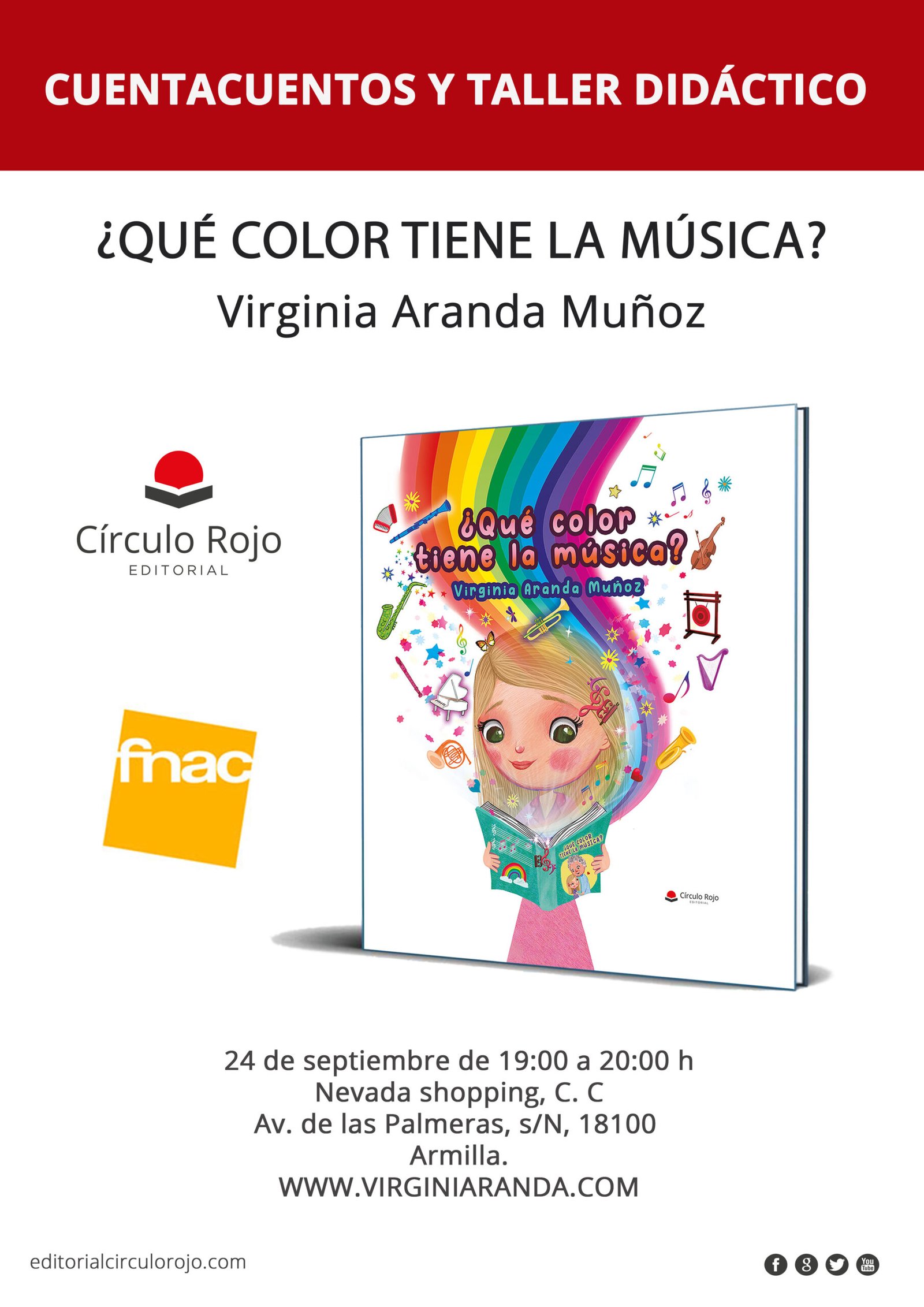 El próximo sábado 24 de septiembre, tendréis la oportunidad de disfrutar del Cuentacuentos en el Centro Comercial del NEVADA, en la librería en FNAC con la obra infantil ¿Qué color tiene la música?